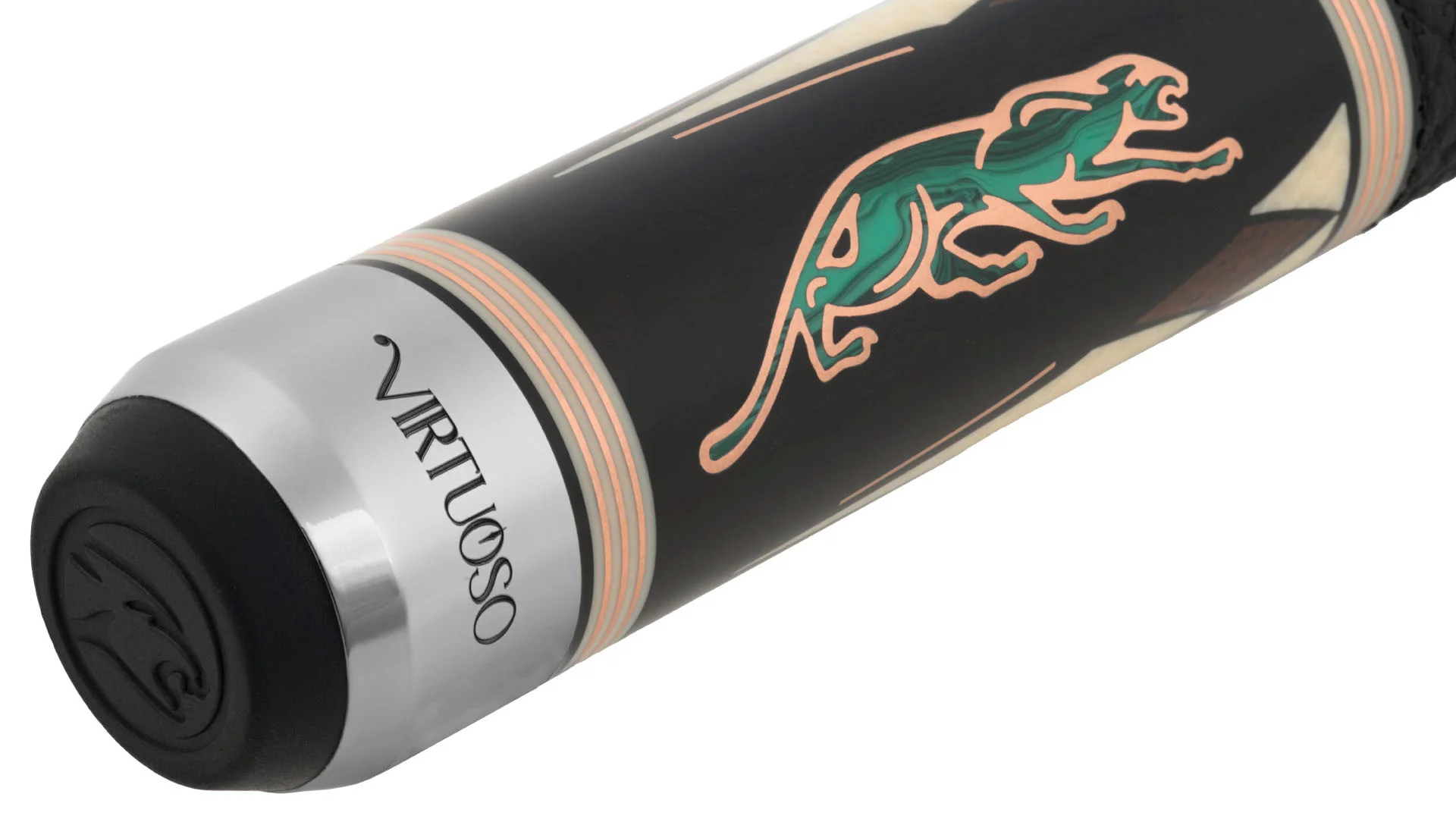 - Ebony butt sleeve with Green Malachite Predator cat, including inlayed Cocobolo, Ivorine, and Green Malachite points